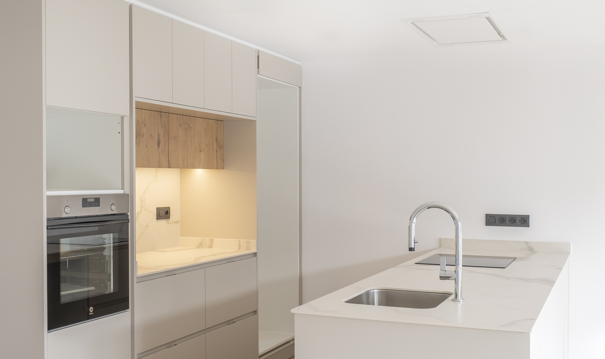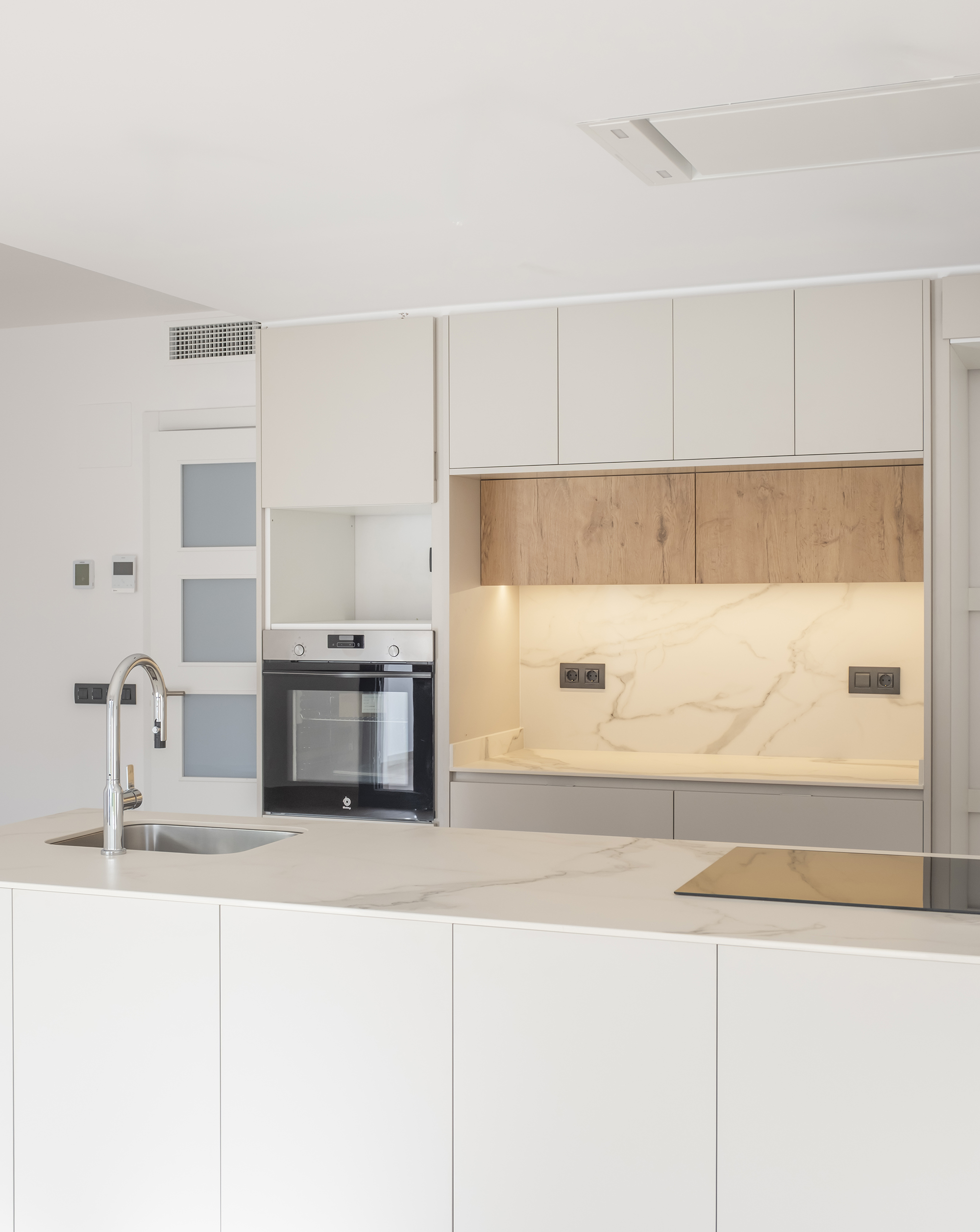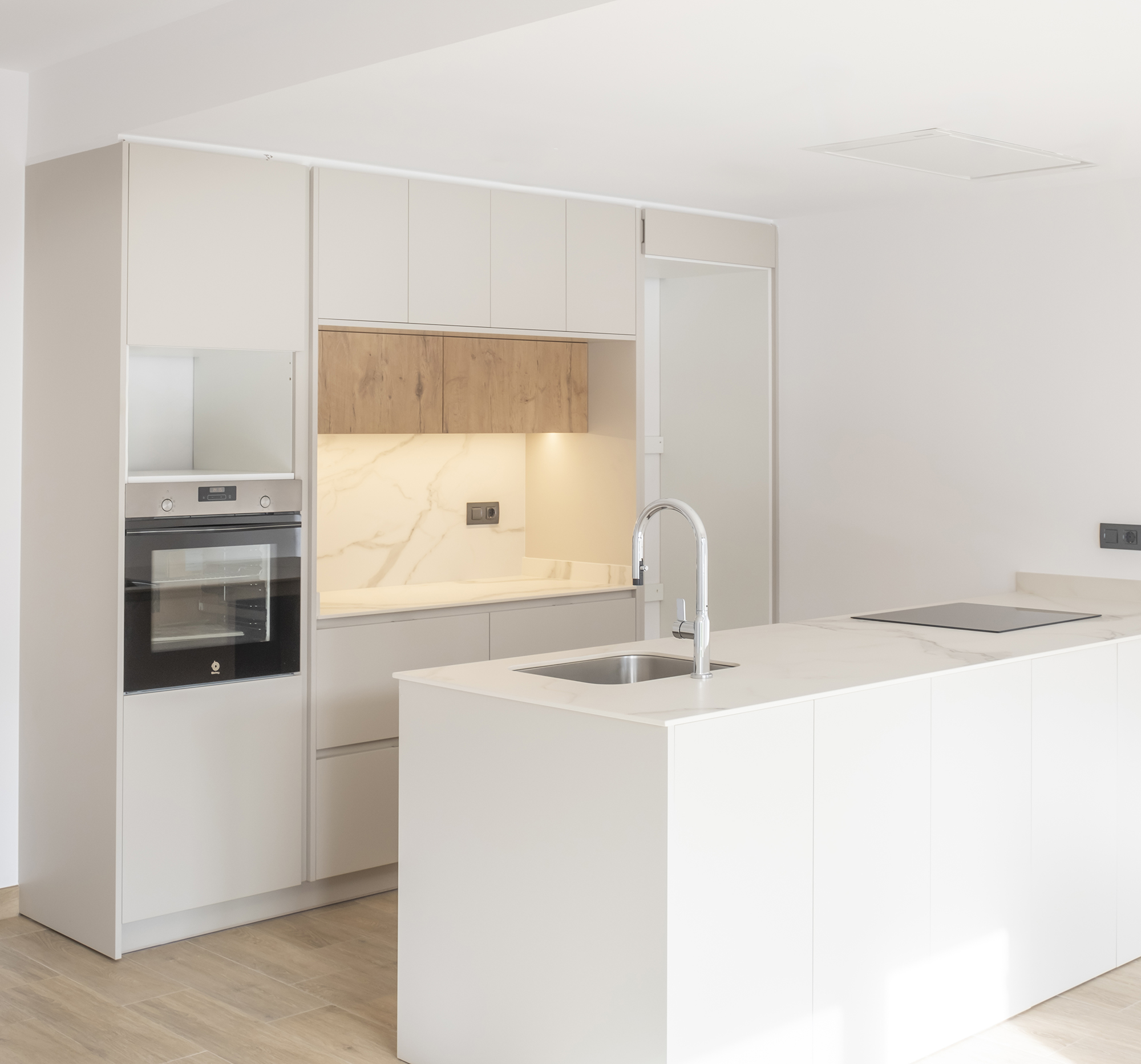 Aquesta cuina destaca per la seva estètica neta i lluminosa, amb mobles blancs que potencien la sensació d’amplitud i ordre. L’illa central, amb encimera clara, esdevé l’eix funcional de l’espai, mentre que els tocs de fusta aporten calidesa i equilibri al conjunt. Un disseny modern i atemporal, pensat per combinar funcionalitat i elegància en el dia a dia.