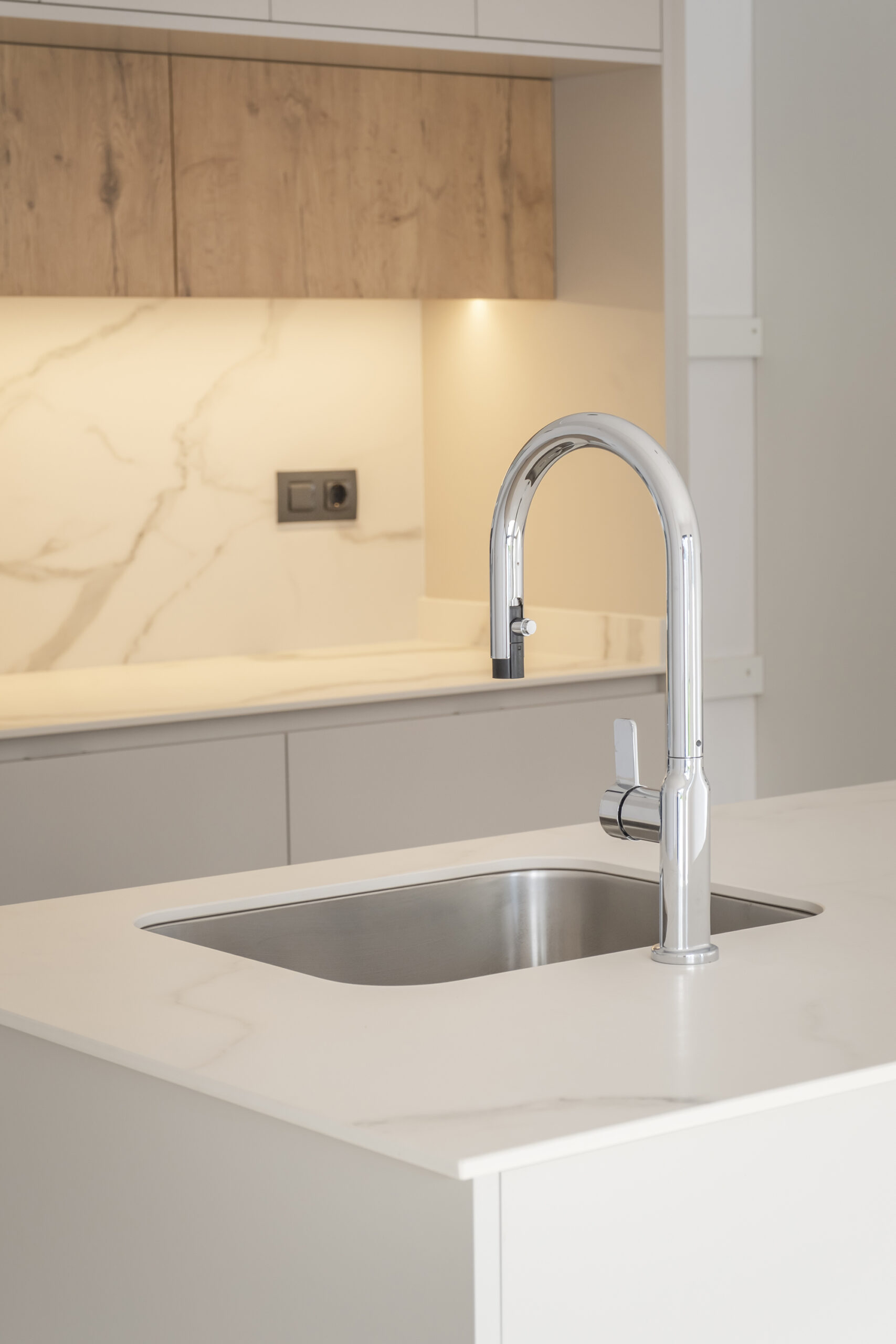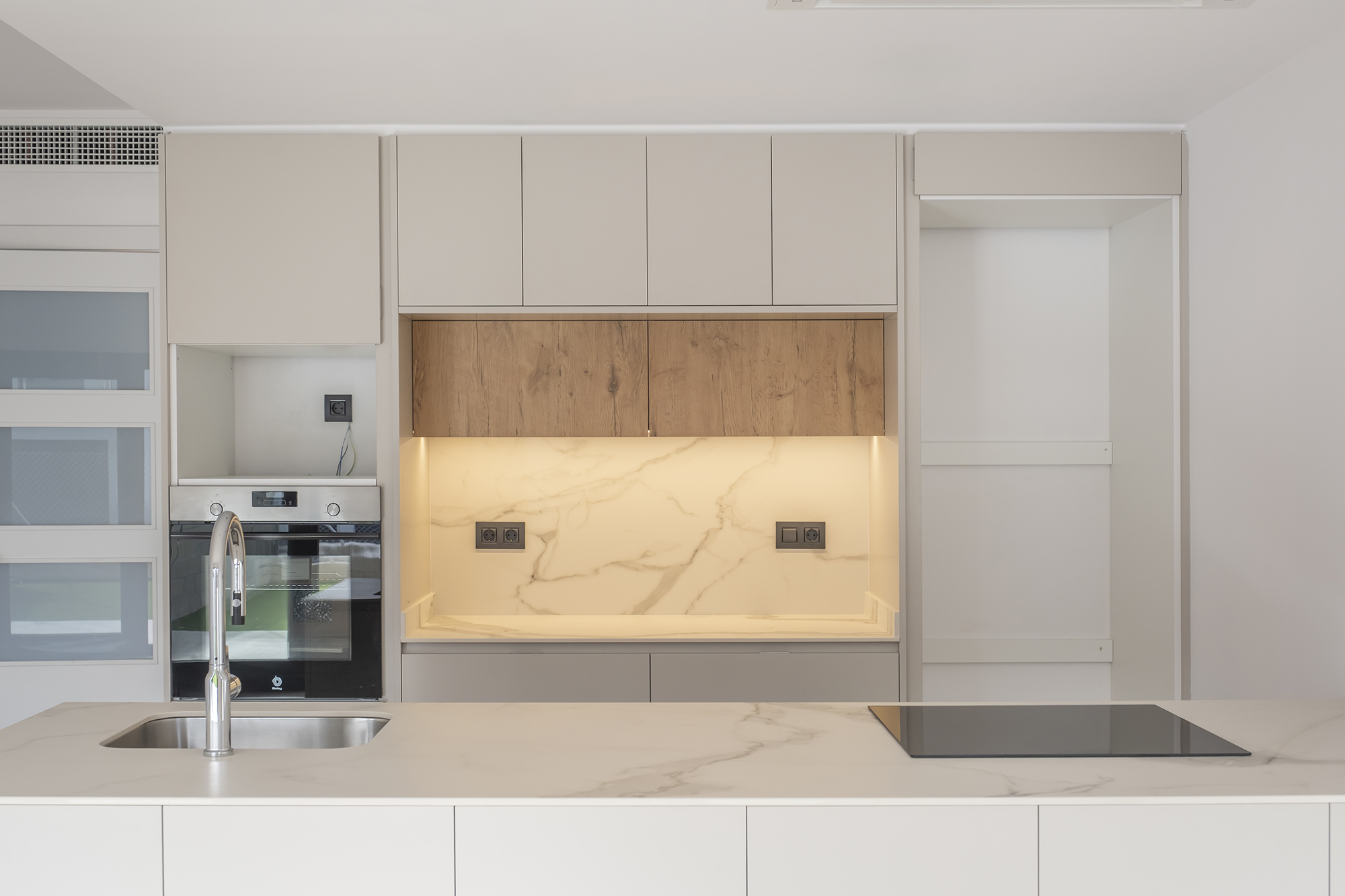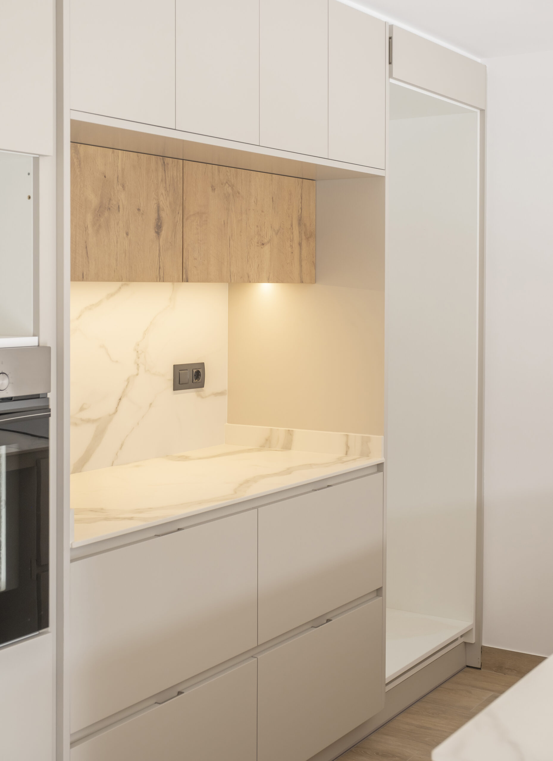 Aquesta cuina destaca per la seva estètica neta i lluminosa, amb mobles blancs que potencien la sensació d’amplitud i ordre. L’illa central, amb encimera clara, esdevé l’eix funcional de l’espai, mentre que els tocs de fusta aporten calidesa i equilibri al conjunt. Un disseny modern i atemporal, pensat per combinar funcionalitat i elegància en el dia a dia.